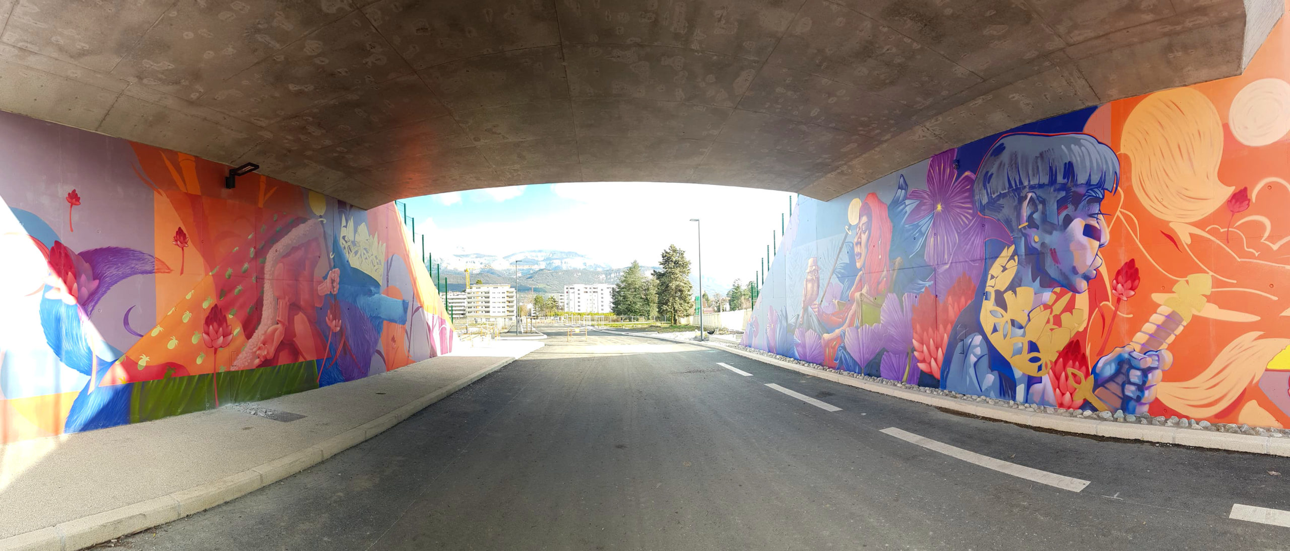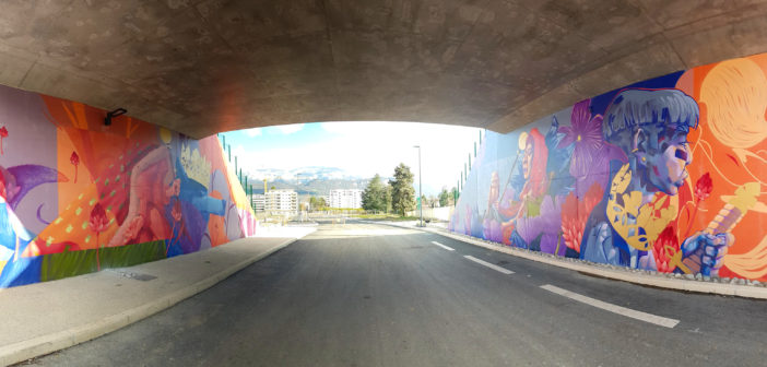 Les artistes Koye et EnoraOne ont réalisé une fresque murale sous le nouveau passage sous voie de l’avenue Philippe VIAL. Du 18 au 28 février, les deux grapheurs ont donné vie à leur œuvre de street art en s’inspirant de la faune et de la flore locale (loup, chouette, renard ou encore gentiane). Cette réalisation s’inscrit dans le projet de création d’un parcours de fresques murales dans la ville.