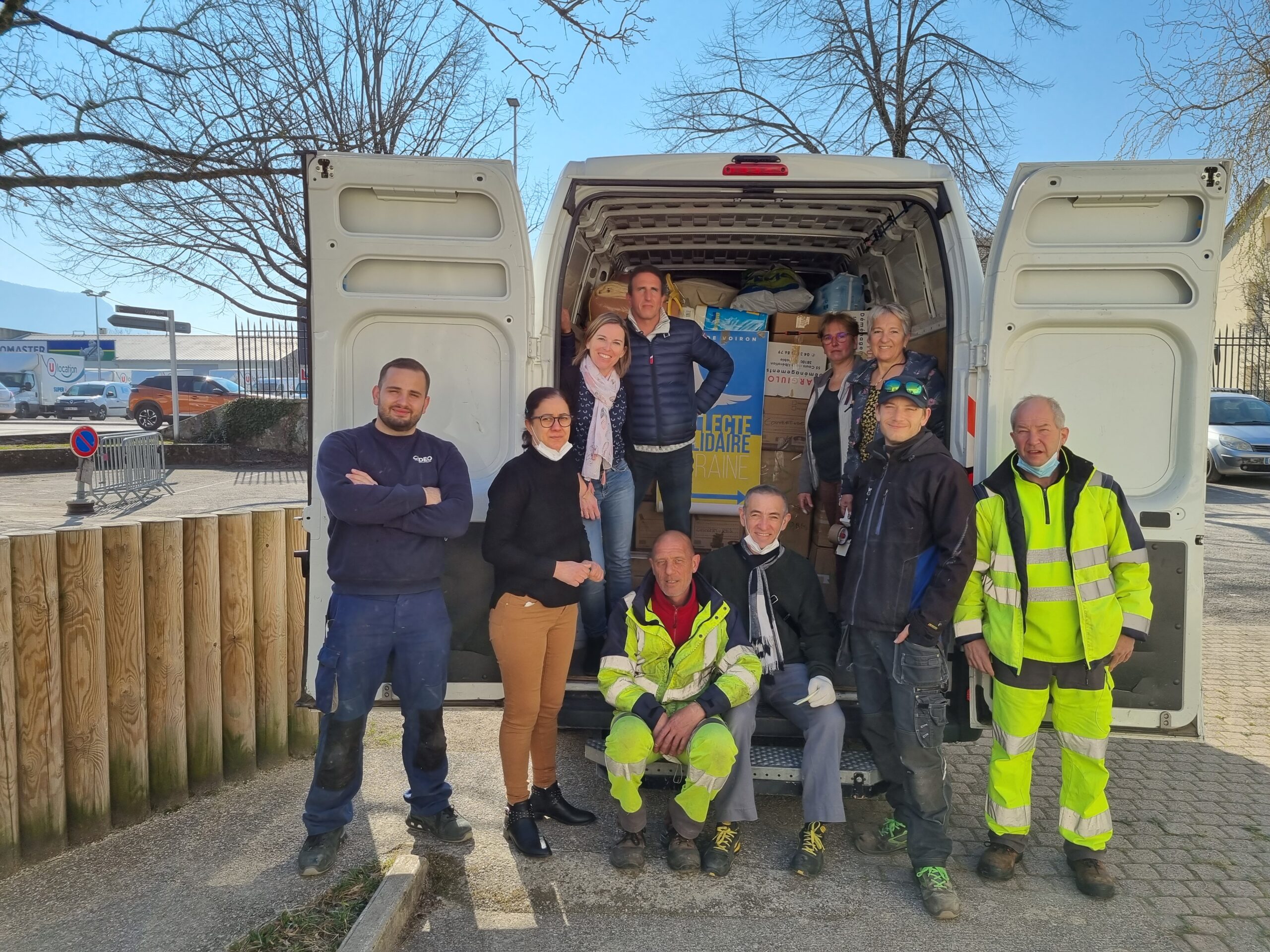 Virginie et Véronique ont pu bénéficier d’un renfort à partir du vendredi matin avec l’arrivée de Jean-François, Ludovic, Olivier, Cédric, Leïla, Stéphane, Thierry et Géneviève Rigot (bénévole voironnaise) qui ont été d’une grande aide ! Autant de mains nécessaires pour gérer une quantité de dons impressionnante ! Le premier camion de produits de première nécessité collectés a pu partir vendredi 4 mars dernier pour le centre départemental de La Protection Civile !