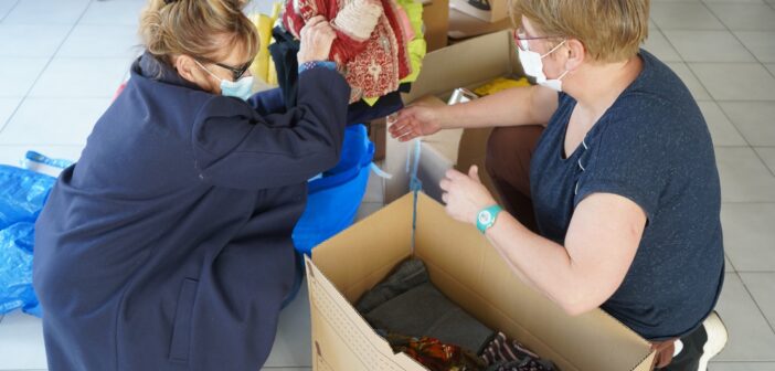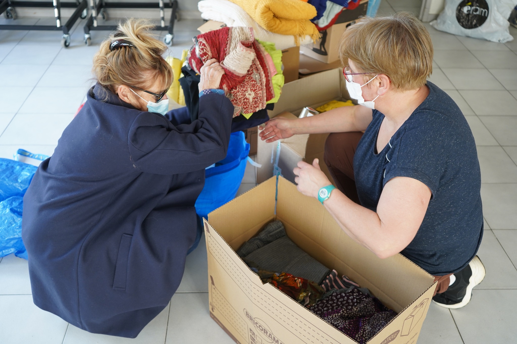 Virginie GOTTI et Véronique GARAMPON ont compté parmi les premiers agents mobilisés pour accueillir les Voironnais dès l’ouverture de la collecte. Effectivement, le jeudi matin, des habitants sont venus en masse témoigner leur solidarité aux Ukrainiens apportant de nombreux dons de tous types : vêtements, denrées alimentaires, produits d’hygiène, kits de survie, médicaments ou encore kits de premiers secours. Dès les premières heures, la générosité a été telle que Virginie et Véronique ont dû redoubler d’efforts pour réceptionner les dons, les trier et les organiser carton par carton :