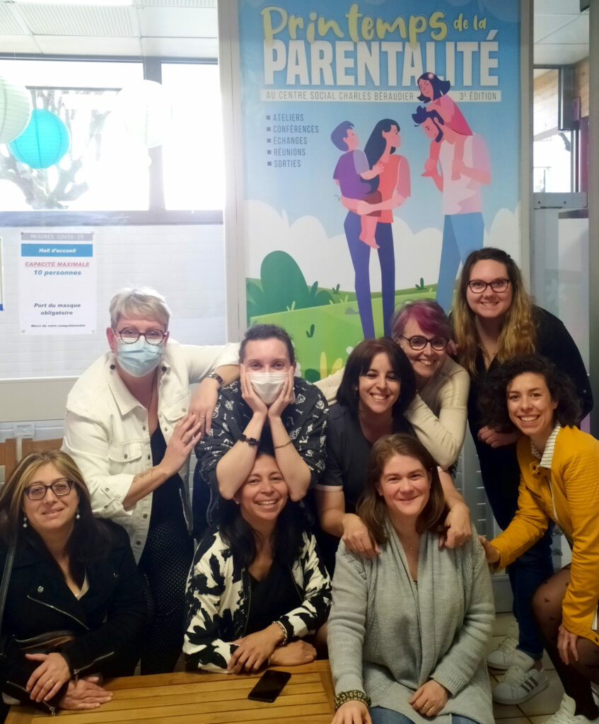L’équipe du Centre social Charles Béraudier en charge d’organiser et coordonner le Printemps de la parentalité : Sylvette, Nelia, Saleha, Maria, Céline, Lulu, Céline, Émilie et Vahy