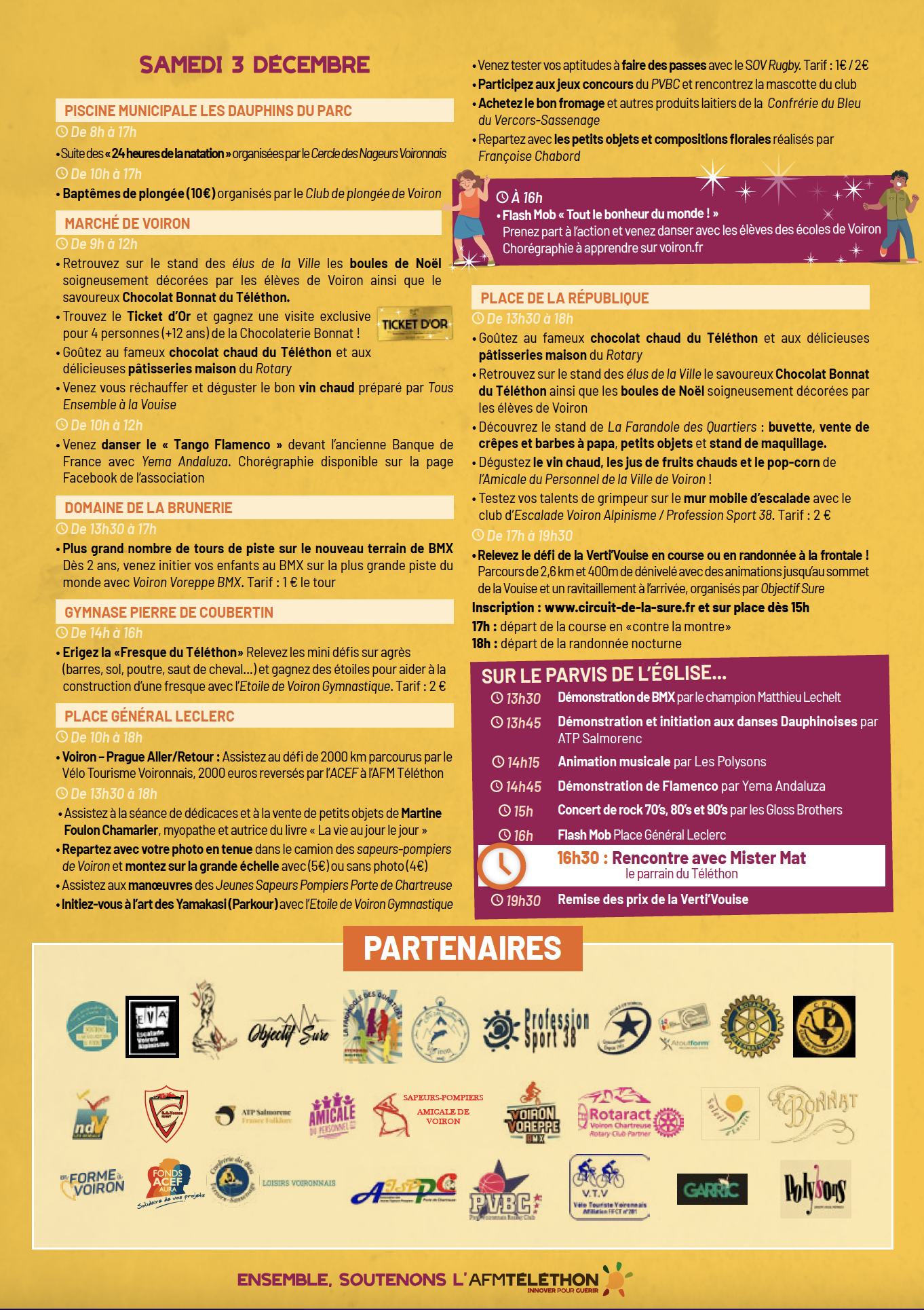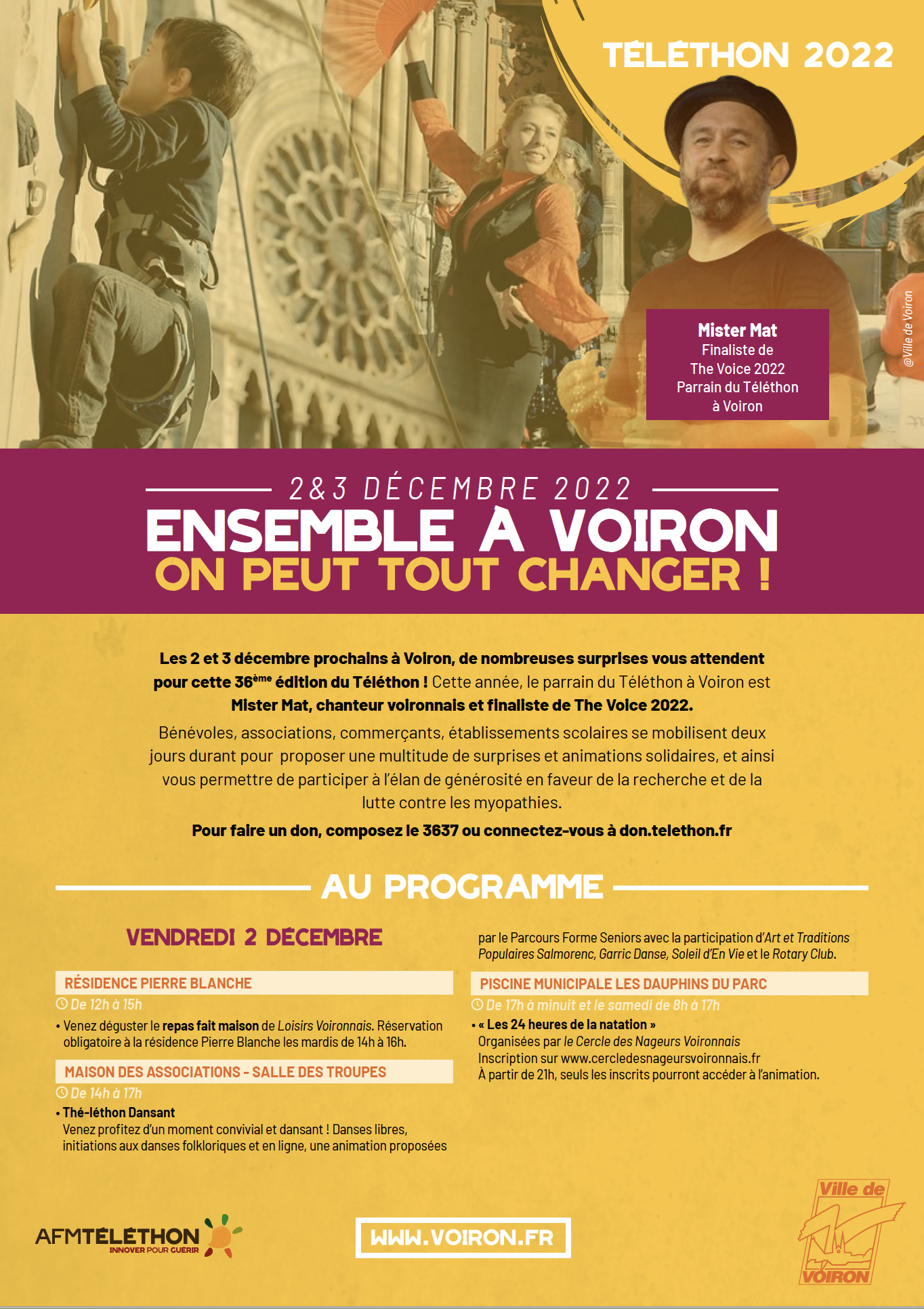Le Téléthon animera de nouveau les rues de Voiron les 2 et 3 décembre prochains ! De nombreuses animations et surprises en perspective pour participer à ce bel élan de solidarité auquel la Ville répond toujours présente.