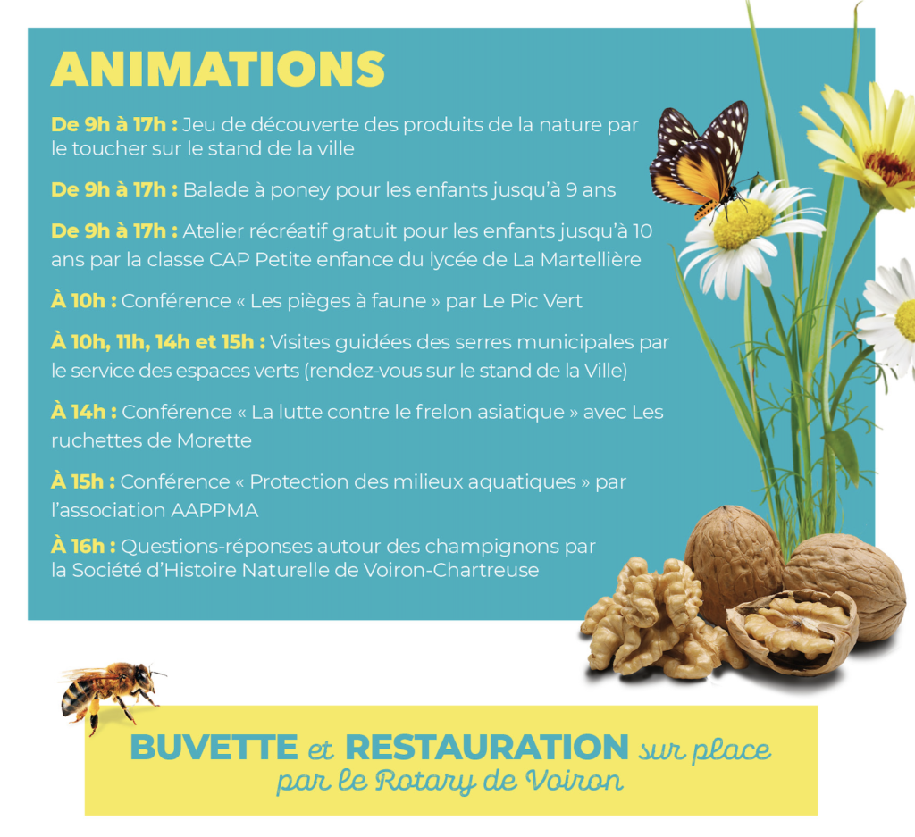 La journée sera rythmée par de nombreuses animations pour petits et grands : démonstration d’éducation canine, balade à poney, conférences, visites guidées des serres municipales, présence d’une ruche pédagogique pour en apprendre plus sur le travail des abeilles et d’un simulateur de pêche, sensibilisation aux bonnes pratiques du tri sélectif avec le Pays Voironnais, etc.